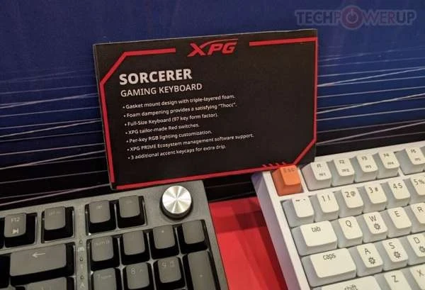 XPG также оставила немного места на стенде для своей новой линейки игровых клавиатур Sorcerer — стандартная модель представляет собой «полноразмерную» плату с форм-фактором 96 %, доступную в черном или белом цвете. Простая эстетика Sorcerer может быть нарушена несколькими (тремя) дополнительными клавишами с акцентом XPG. Серебристый диск управления, похоже, является стандартным креплением. Конструкция с прокладкой и тройным пенополиуретановым слоем обеспечивает изысканный и приятный набор текста. XPG оснастила Sorcerer специальными переключателями Red и системой RGB-подсветки на каждую клавишу (управляется и настраивается с помощью программного обеспечения XPG Prime).