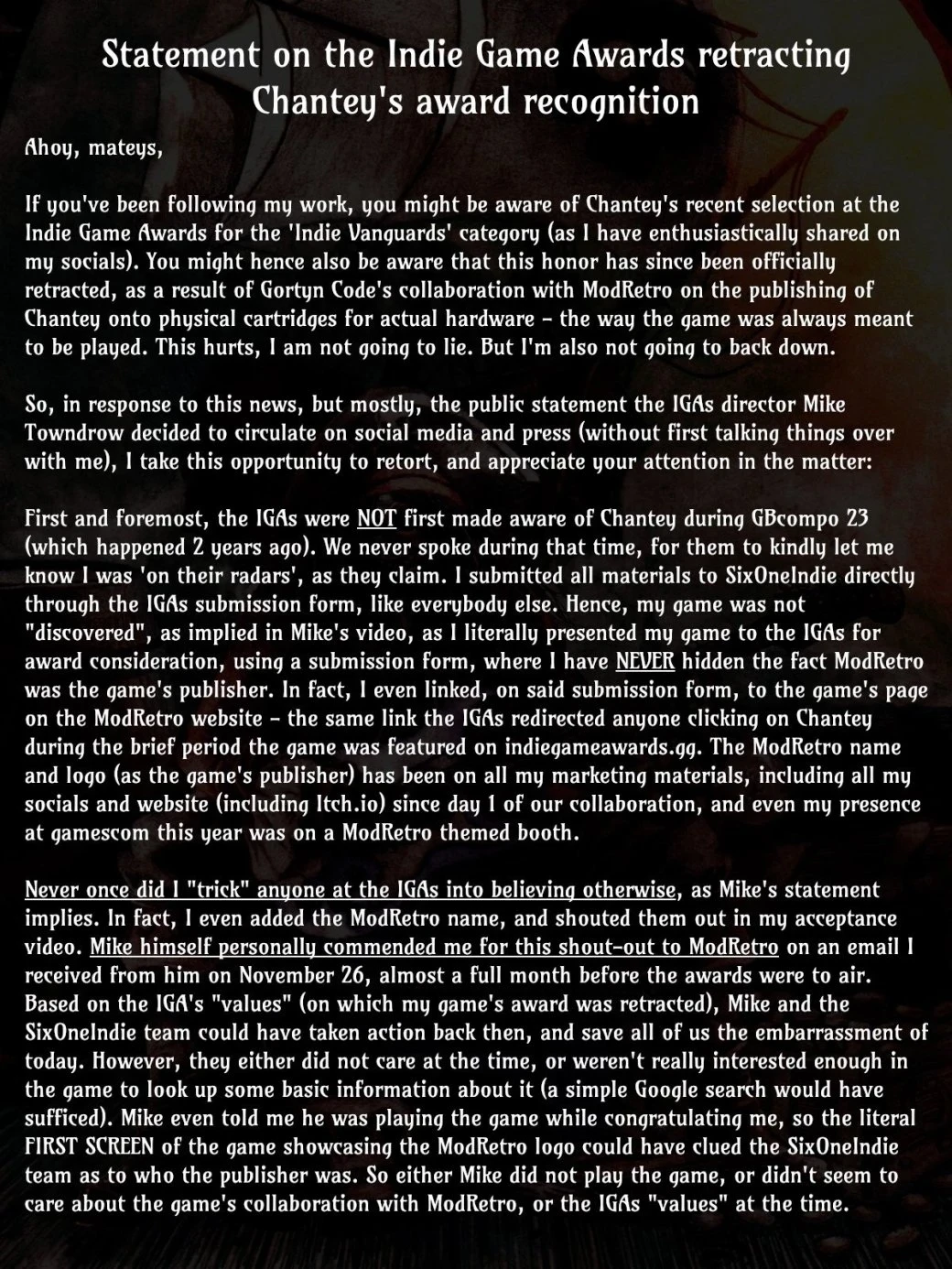 Gortyn Code в свою очередь не стал мириться с ситуацией, особенно с тем, как её преподнесла The Indie Game Awards. По словам разработчика, факт сотрудничества с ModRetro не скрывался, и о нём было давно известно как организаторам, так и членам жюри. Кроме того, сам продюсер премии лично похвалил Gortyn Code за прямую ссылку на издателя.