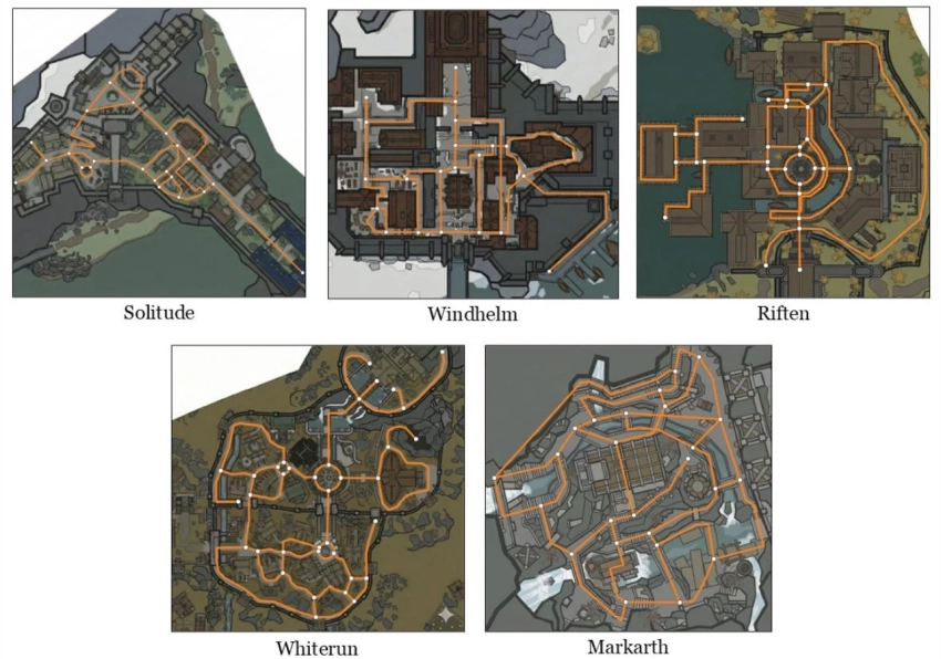 Для проведения анализа были взяты карты пяти городов. Это Солитьюд, Виндхельм, Рифтен, Вайтран и Маркарт. В специальной программе спирант отметил дороги, проходы и лестницы, хотя от расчётов перепада высот и разницы в масштабах поселений эксперт отказался. Однако даже с учётом всех этих условностей удалось сделать интересные выводы.