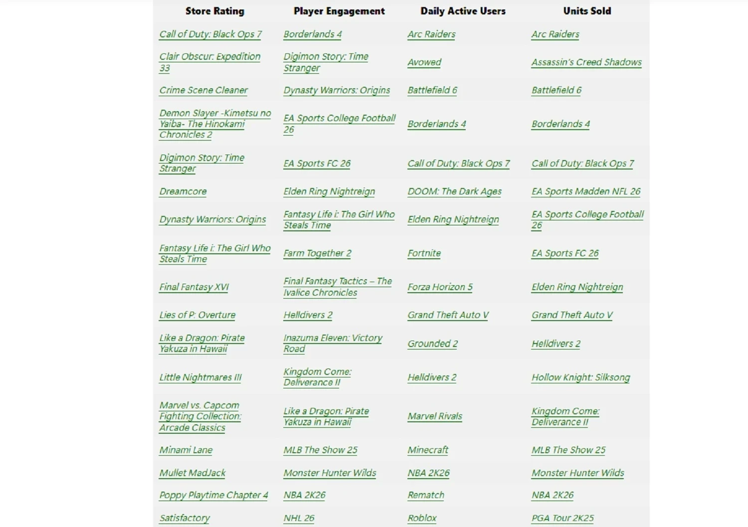 • Ежедневное количество активных пользователей — игры, дополнения и крупные обновления с наибольшим количеством активных пользователей за сутки в 2025 году.
